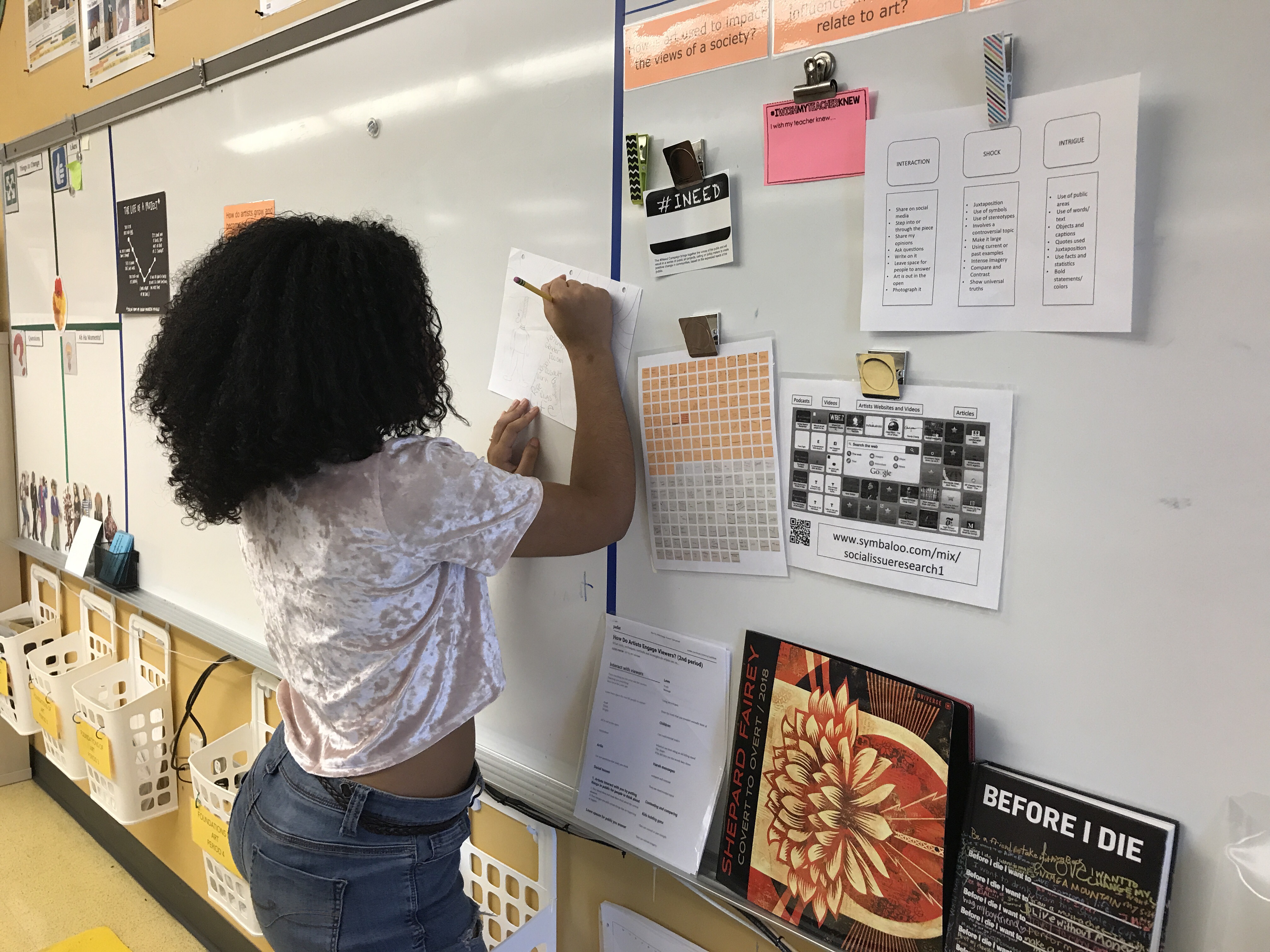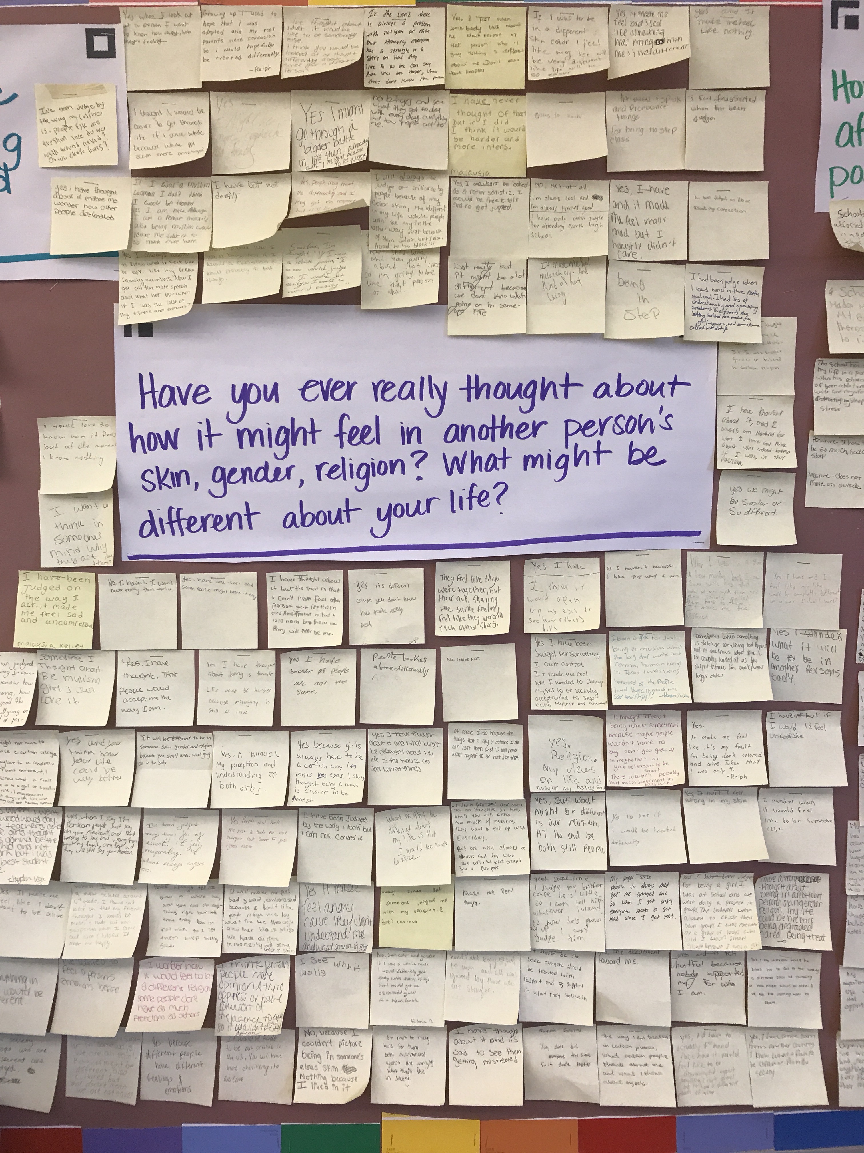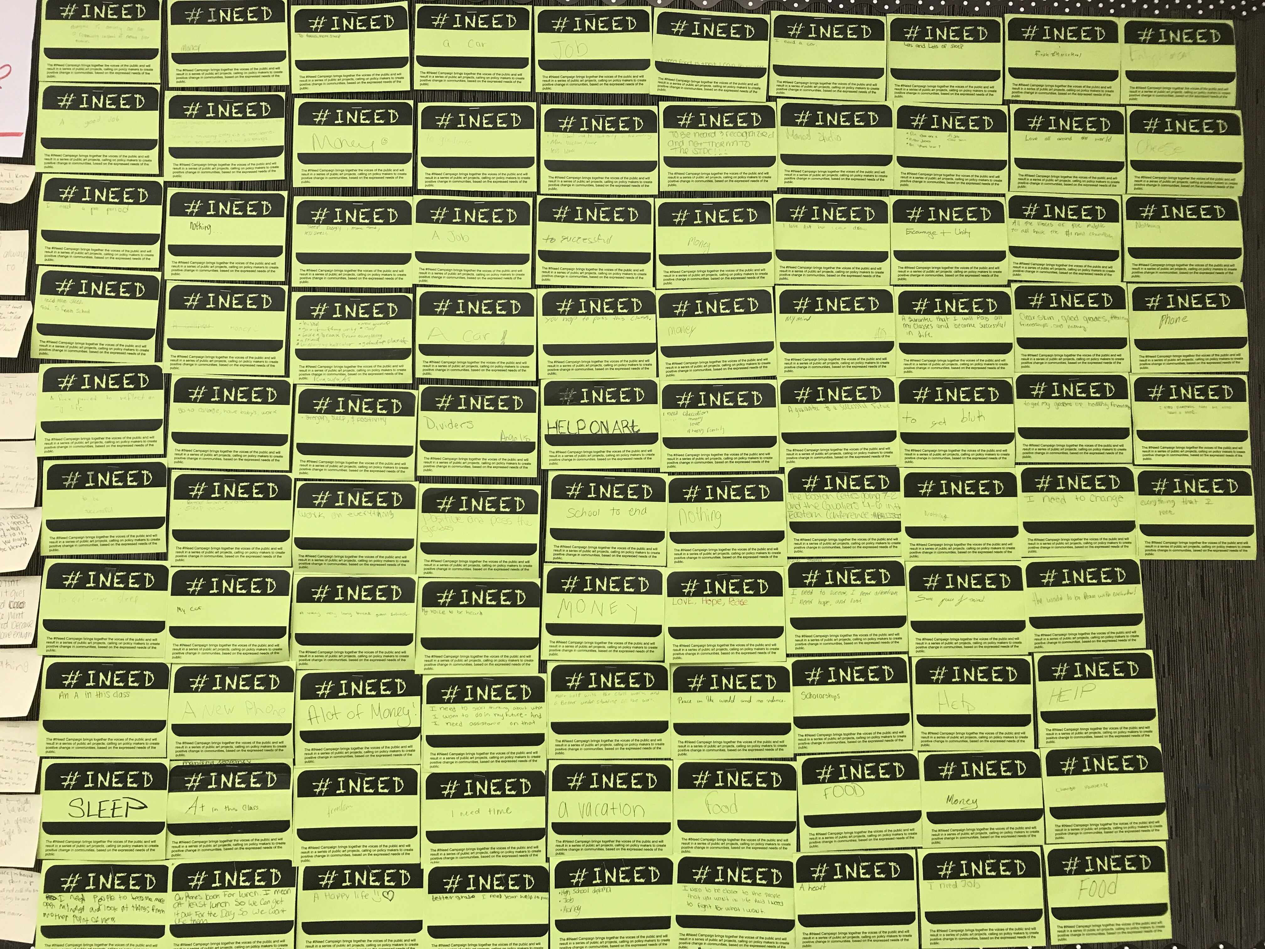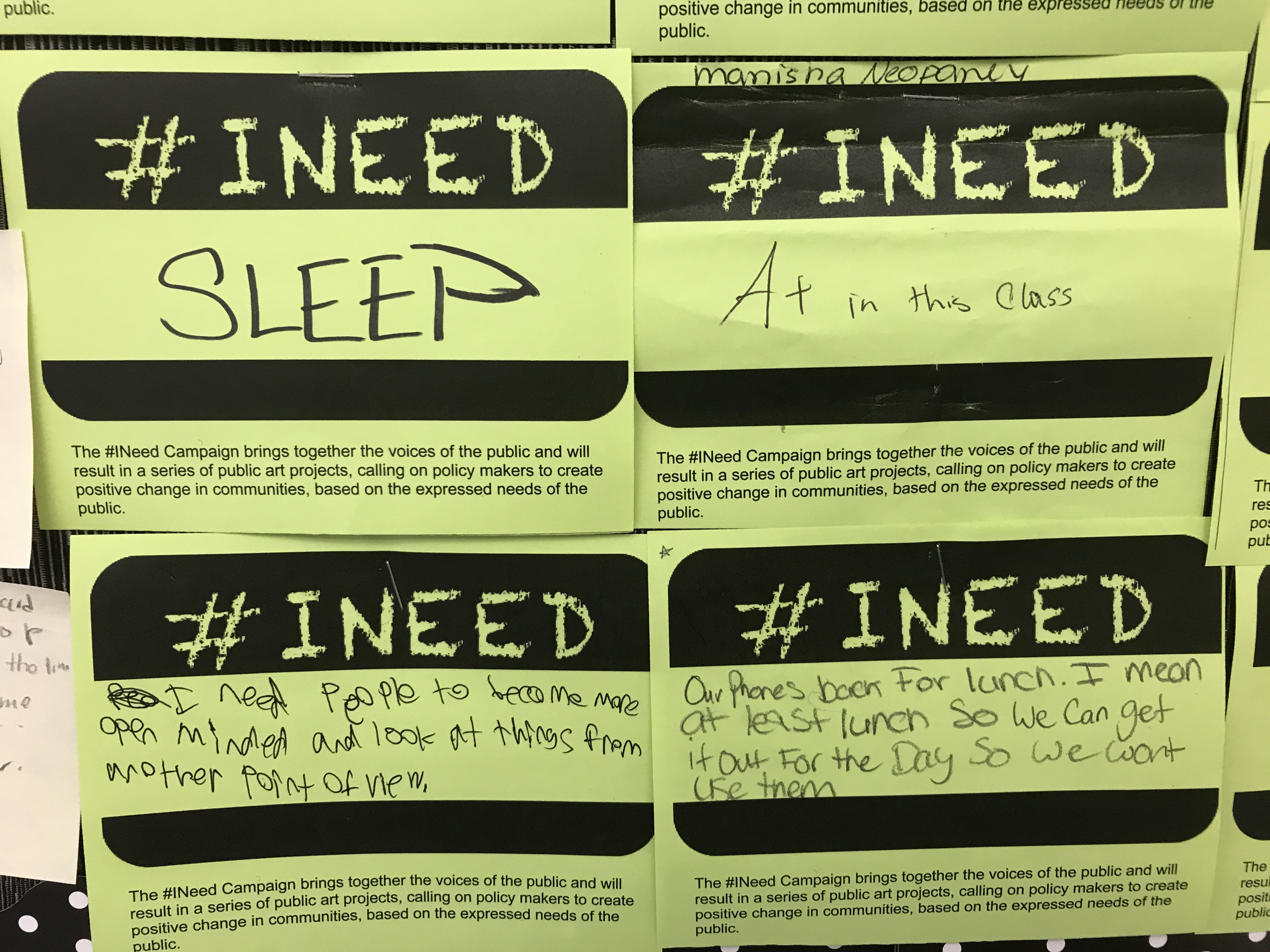 Students have finished their social issue piece that I posted about here in this post, Making Space for Students’ Voices. My goals for the unit were lofty but I am thrilled out of mind to share with all of you how it actually went. Students were able to share some personal things through a variety of methods – we used #INEED as entrance tickets one day, then the next used #IWISHMYTEACHERKNEW as entrance tickets. These were all posted, along with the post-its from the first day.