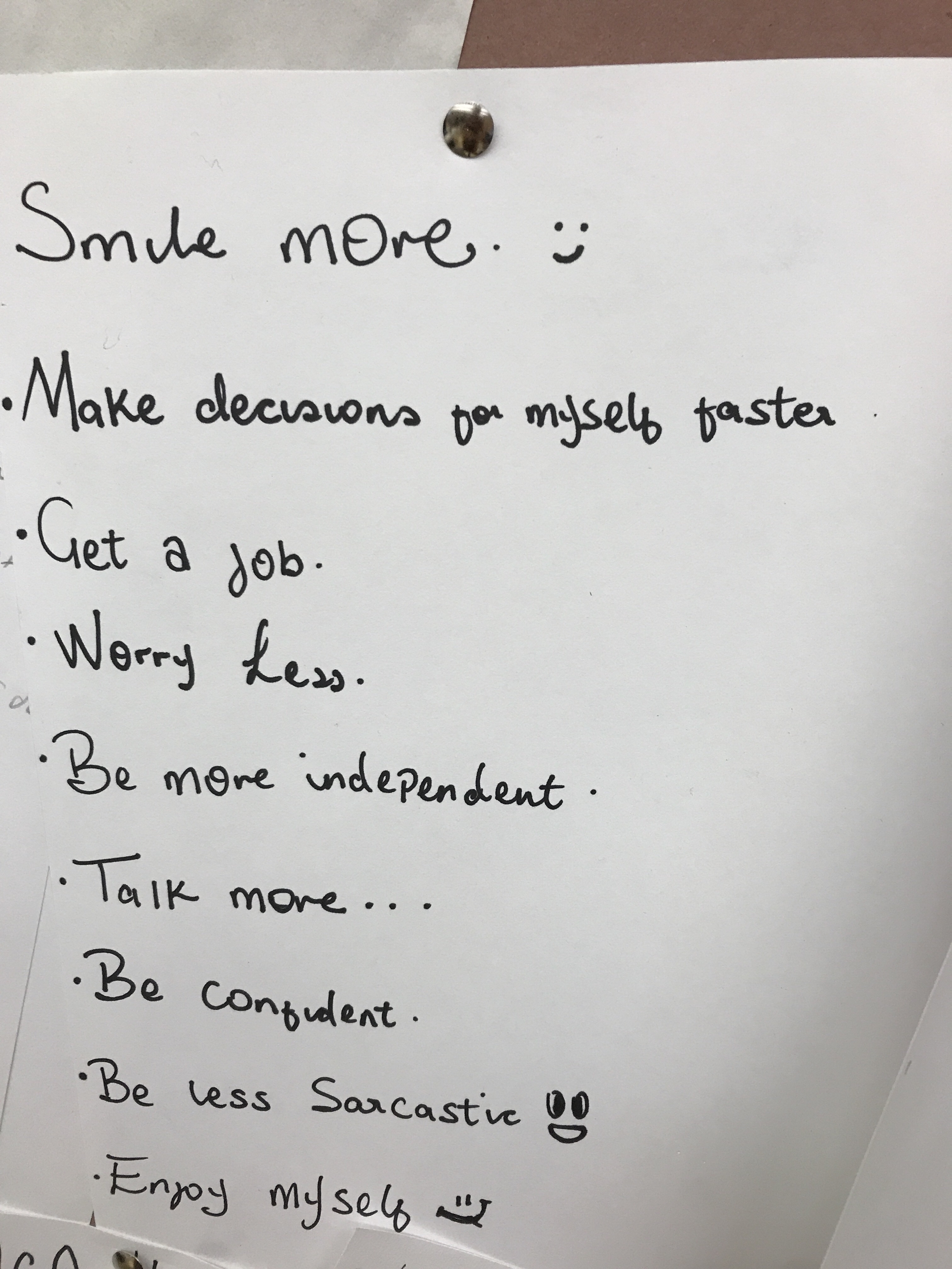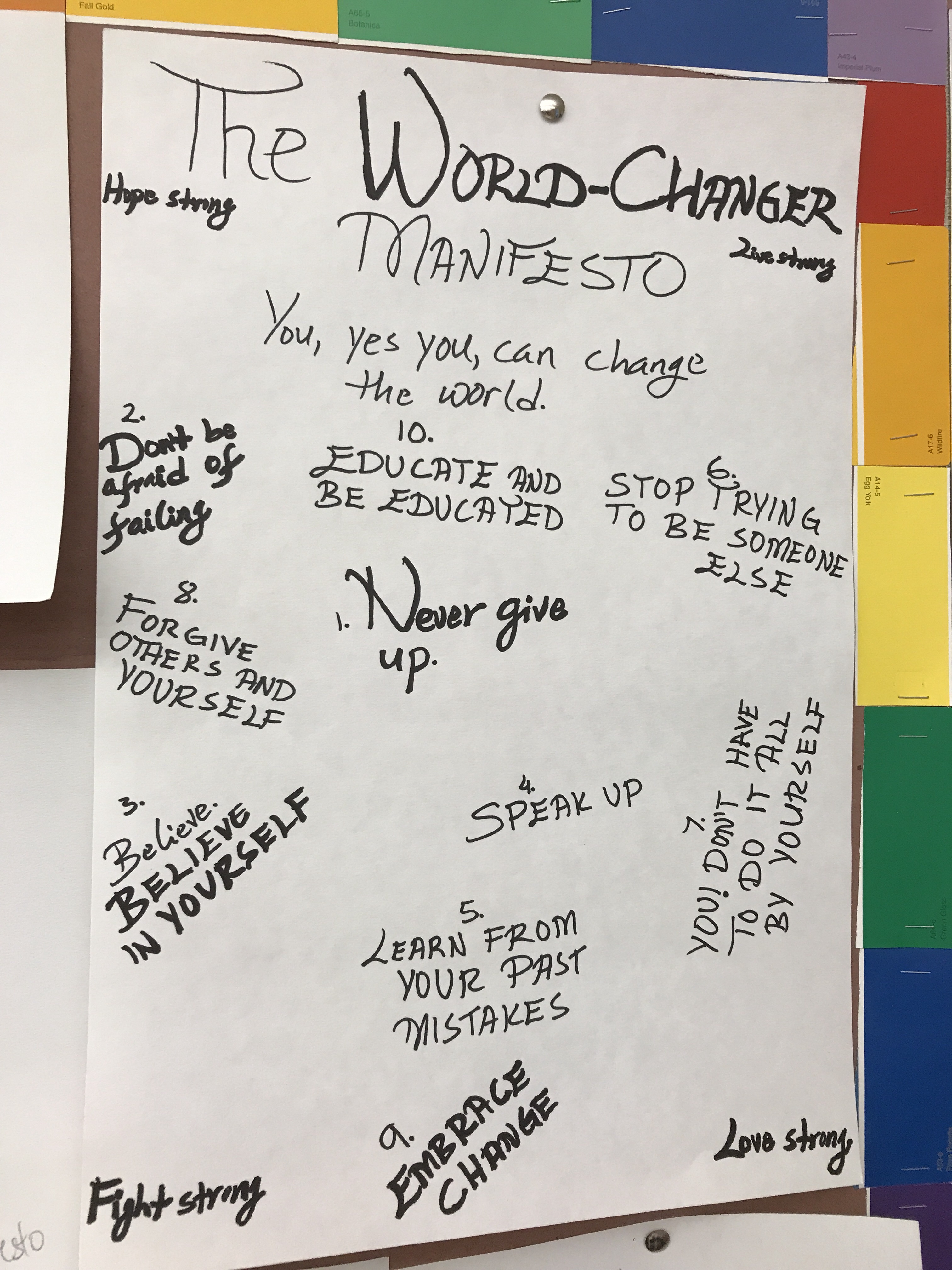 Then, we created our own. They aren’t amazingly creative in terms of visuals – but they are wonderful, each student really created their own. And they’re all posted in the room to remind us where we are headed.